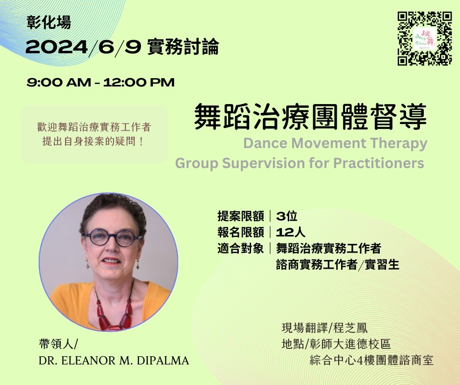 Dr. Eleanor DiPalma博士目前是紐約州立大學流行設計學院的教授,也是美國註冊高階舞蹈動作治療師督導 (BC-DMT) 、美國紐約註冊創造性藝術治療師 (LCAT) 、美國國家註冊心理諮商師 (NCC)等專業人士。她曾是紐約市和紐約州公共服務計劃(包含舞蹈治療、管理和專業發展培訓、糾紛協處和語言多樣性等)的創新者和執行主任,她也曾是Marian Chace 基金會的獲獎者。 (感謝志工協助工作坊籌辦與攝影/輔導與諮商學系)